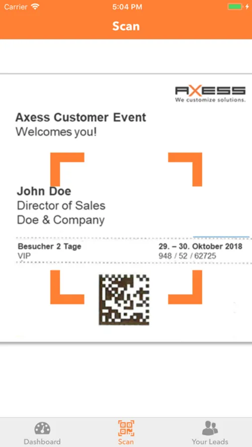 During the fair, the exhibitors' booth staff uses the Axess.Leads App to collect leads data by scanning the ticket barcode at the fair visitor's Print@home, mobile or Apple Wallet tickets.
