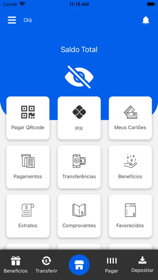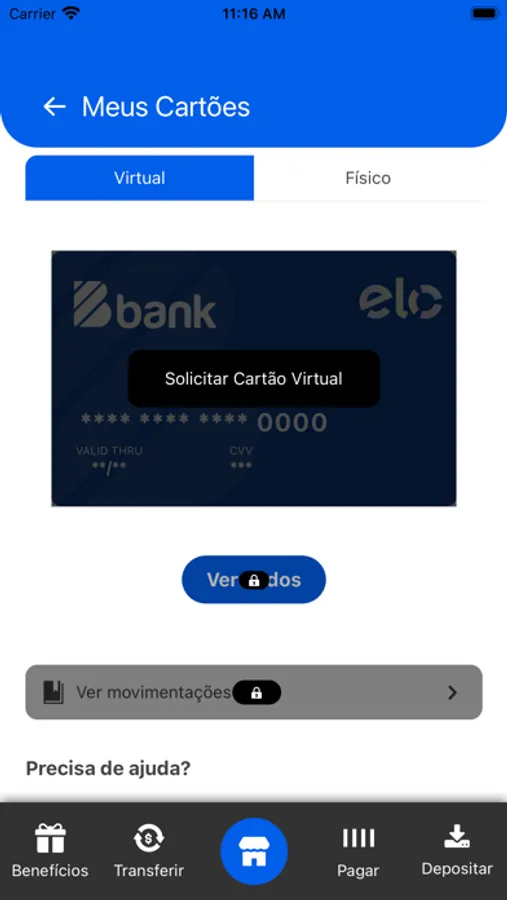 Banco digital completo: conta digital, investimentos, shopping, cartão de crédito, cartão de débito, cartão virtual, QR