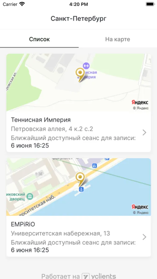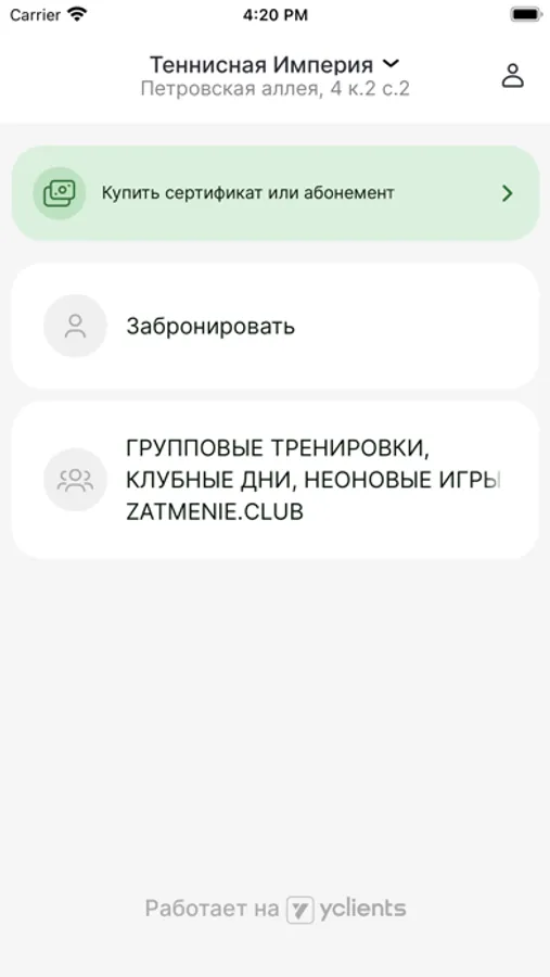 Мобильное приложение спортивного центра «Теннисная Империя» для бронирования кортов, записи на тренировки, регистрации участия в турнирах. Также, вы можете купить абонемент на тренировки по теннису, посещение тренажерного зала, спортивный массаж. В приложении можно следить за расписанием, статусом абонемента, отменять или переносить бронирования.