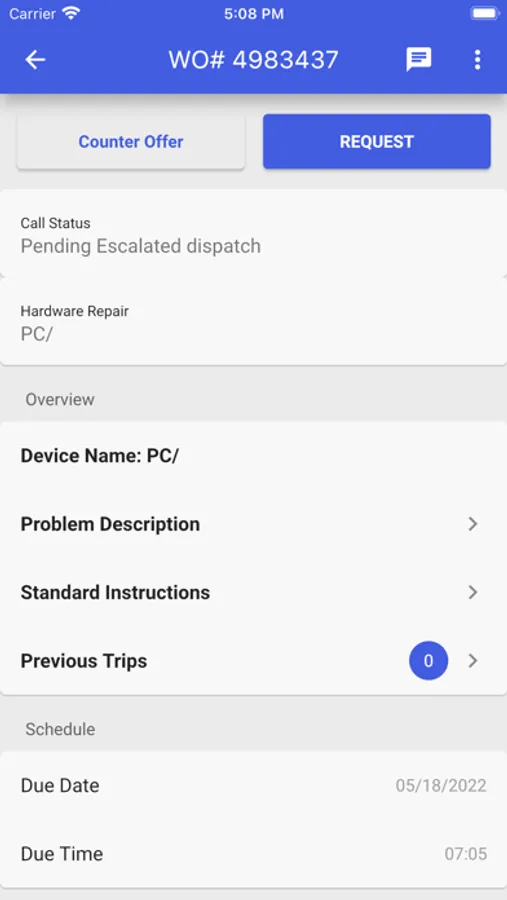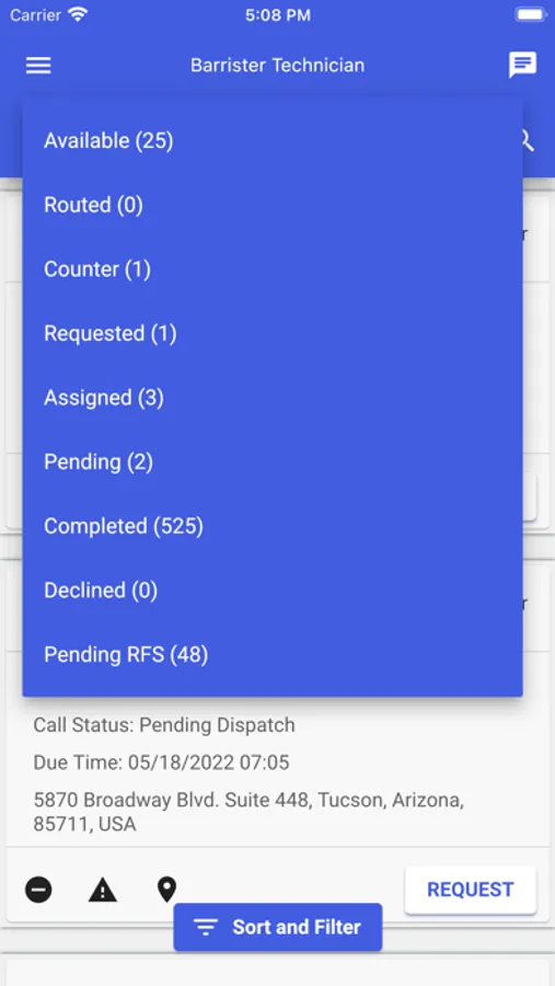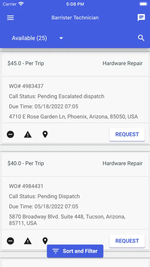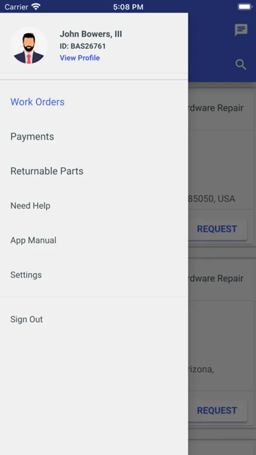 Using the App, the Technician can easily: See Available Work Orders in their area; directly accept the work orders they desire assuming they have passed the qualifying tests for the equipment to be serviced; service work order by specifying ETA; submit paper work online; and provides other features related to service. Technicians can specify, at their profile level, their working hour availability, the way they wish to receive payment, submit online W9 information, and manage their Base Address and distance of work area to view available work order in respective area.
