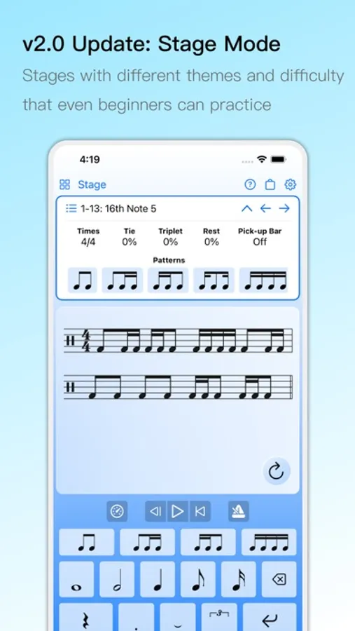 2. Stage mode: Rhythm dictation with levels of different themes and difficulty.