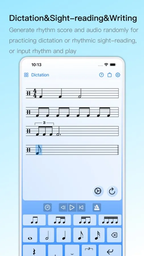 1. Dictation mode: Input notes according to the rhythm you hear, and you can check the answer at any time.