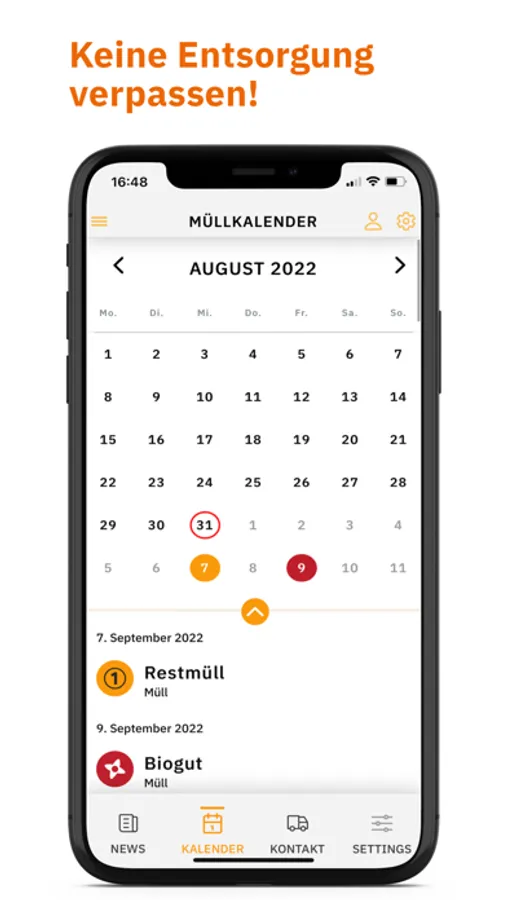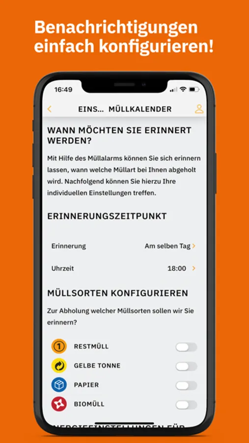 • Erinnerung an die Müllabfuhr: direkt per Push-Nachricht, zum Zeitpunkt deiner Wahl, für eine oder mehrere Adressen