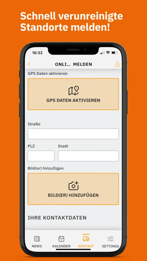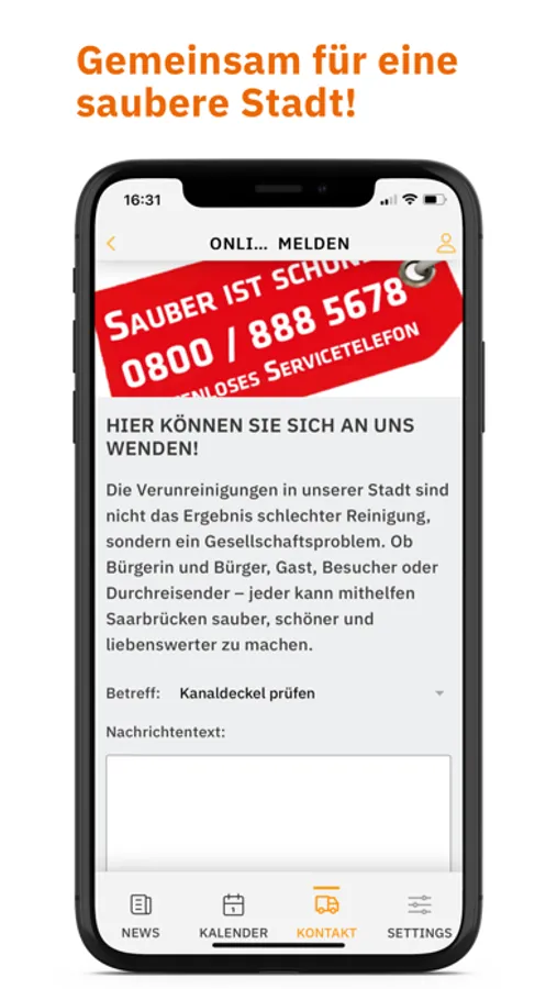 • Kontaktformular: Dreckecken auf öffentlichen Flächen, verstopfte Gullys, überfüllte Container oder andere Anliegen schnell und einfach melden, mit Fotos und Standortübermittlung