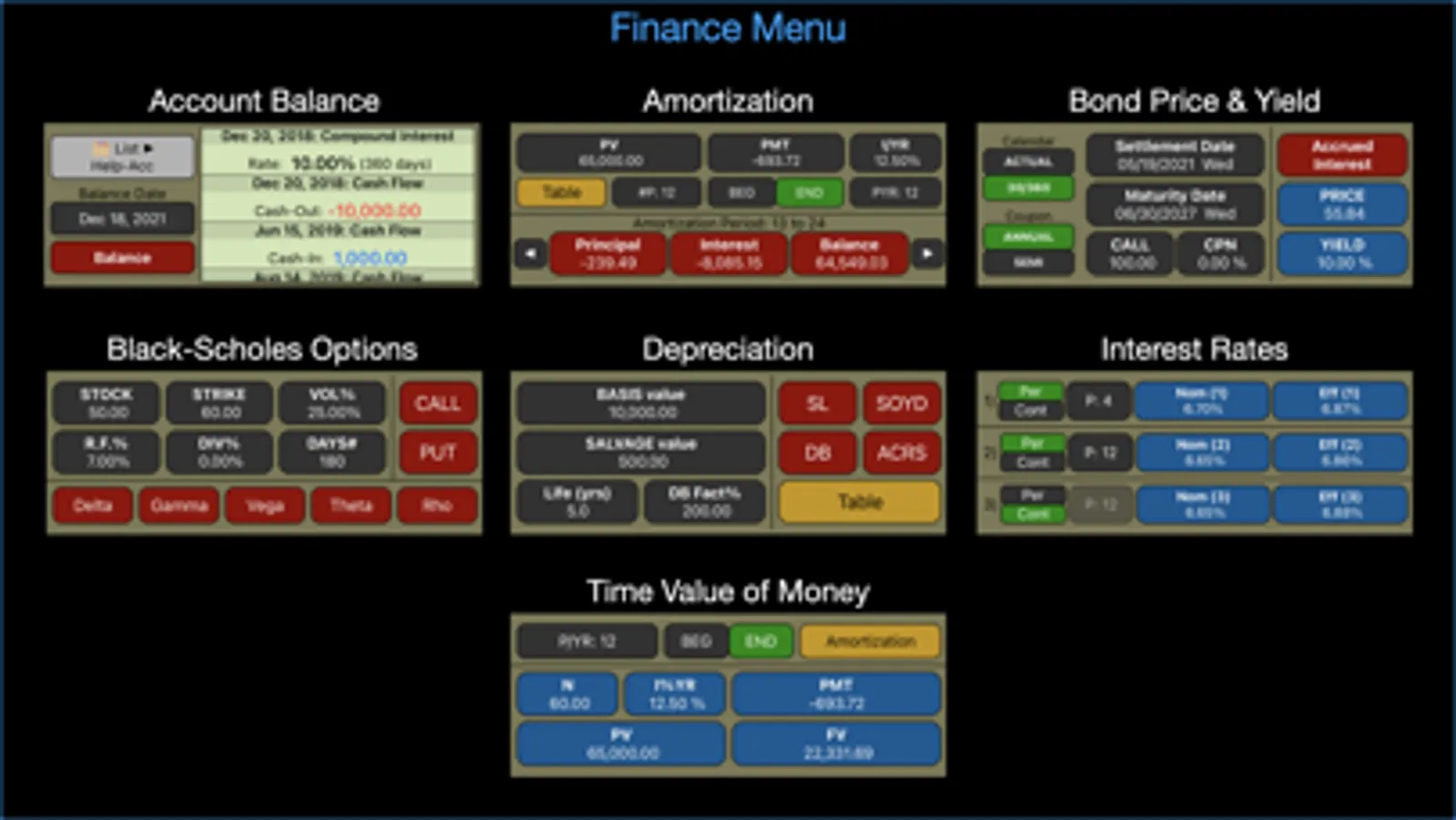 •Depreciation: Calculates depreciation with SL, SOYD, DB or MACRS methods and conventions.