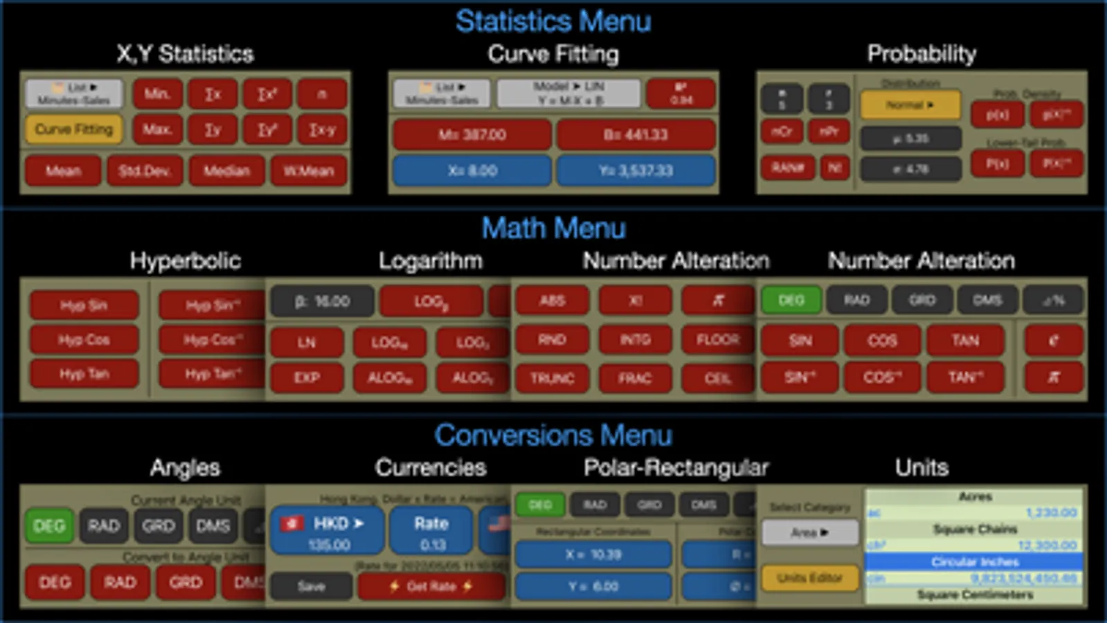 •Angles & Polar: Convert angles between DEG,RAD,GRAD,DMS or Slope % & Polar-Rectangular coordinates.