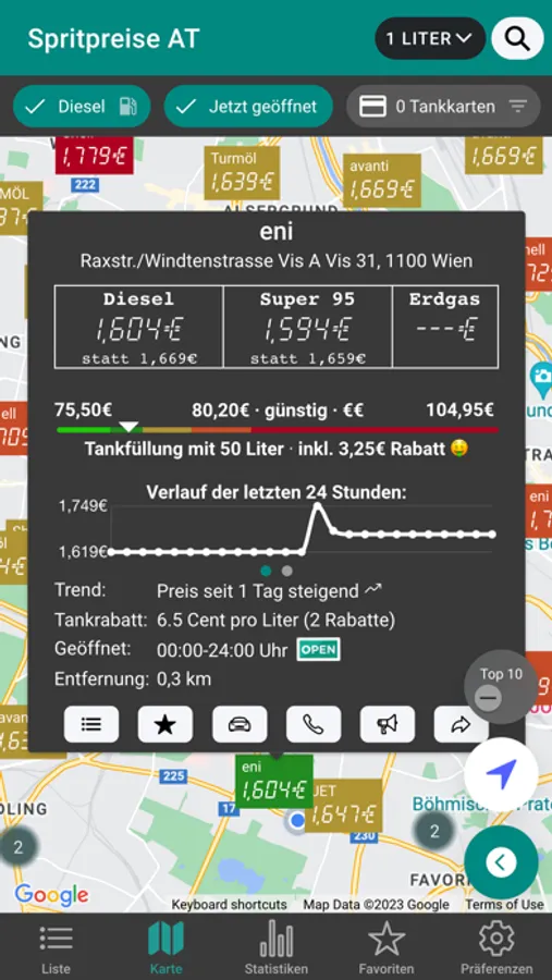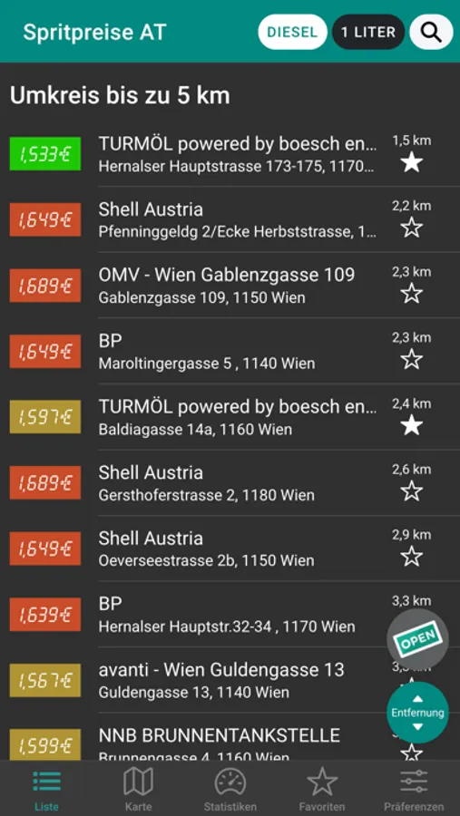 - Favoritenliste: Speichere deine Favoriten und erblicke sofort, welche deiner Lieblings-Tankstellen gerade am günstigsten ist.