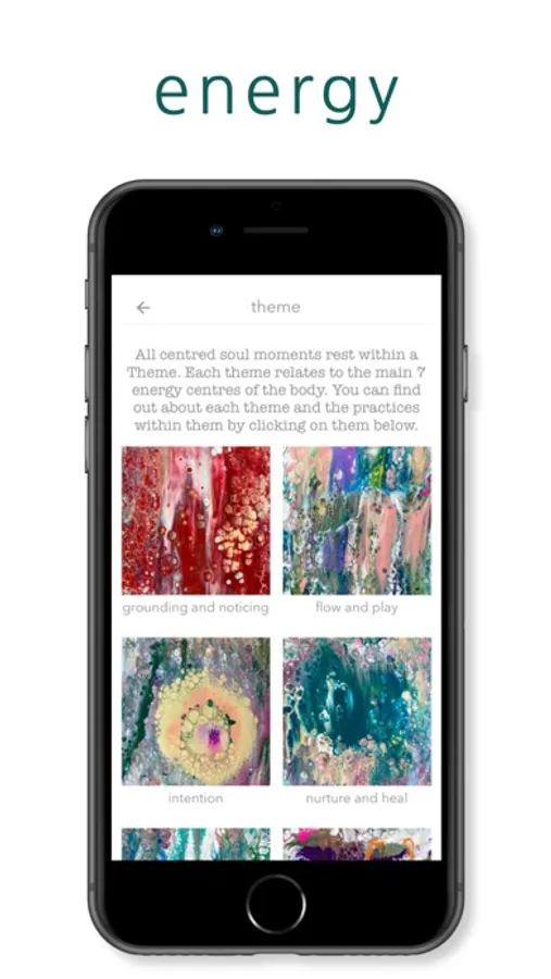 Energy Center: These follow the main seven energy centres of the body in a creative way and include grounding & noticing, flow & play, intention, nurture & heal, words & sounds, seeing and expanding.