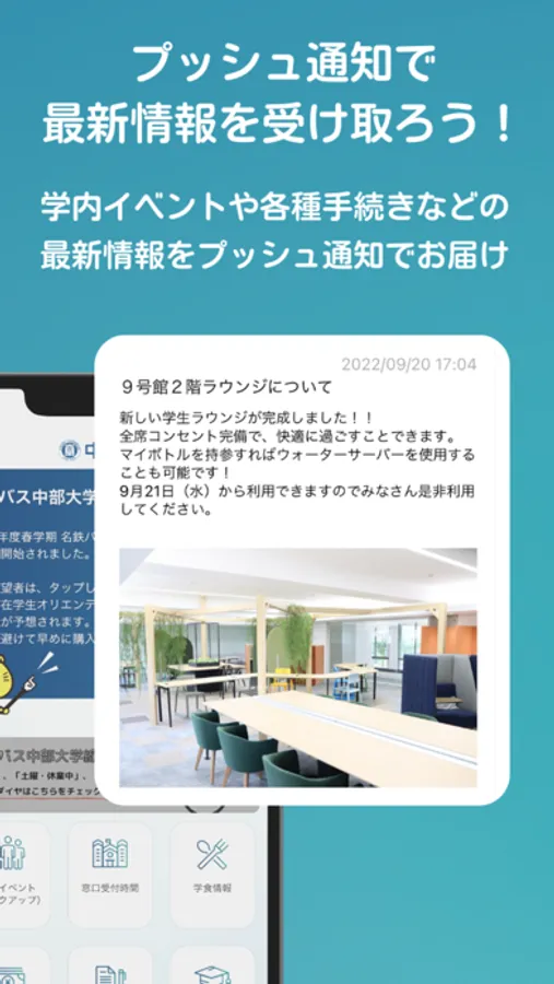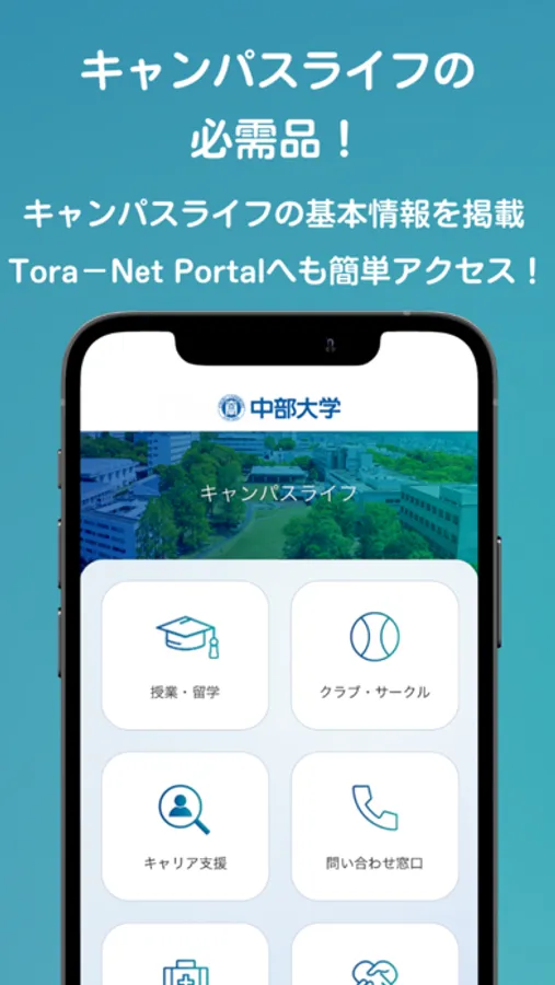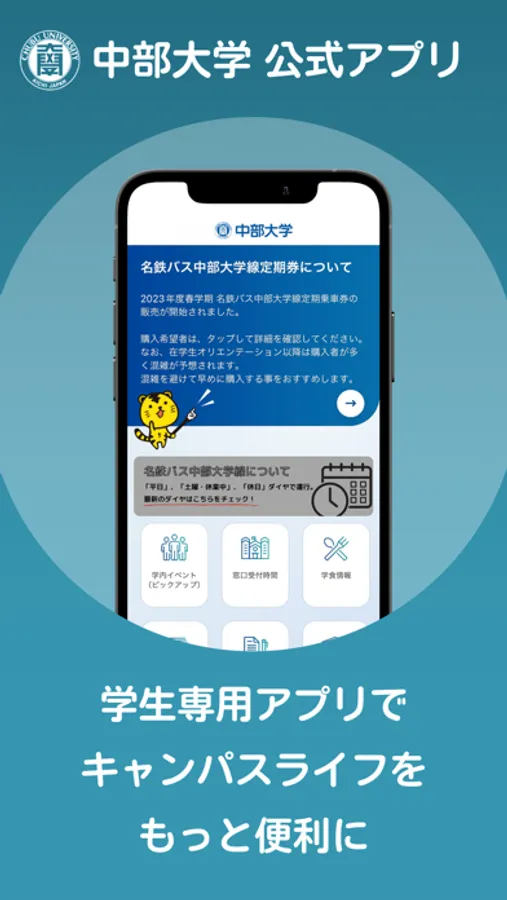 このアプリでは、最新のお知らせや事務手続きについての情報など役立つ情報を日々配信。中部大生のキャンパスライフをサポートするアプリです。