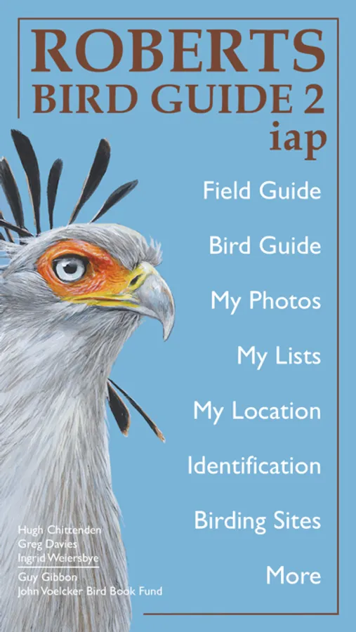 ROBERTS BIRD GUIDE 2 iap is based on the book "Roberts Bird Guide (second edition)" with new illustrations, distribution maps and bird texts for 990 Southern African bird species, including new species and names, and new app functions and features.