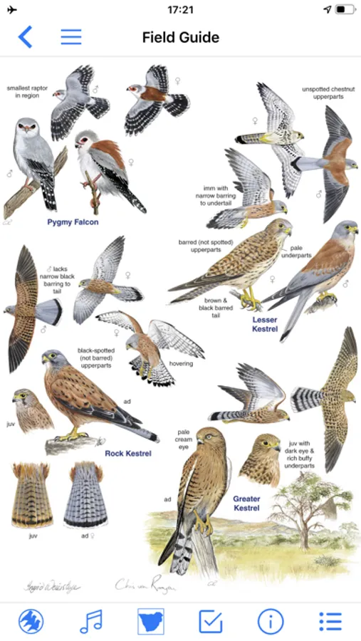 The FIELD GUIDE has family pages like the book and is easier to use. Swipe or zoom the pages, select a bird, play the sound, add a sighting, view the distribution or text, or open the BIRD PAGE for more detail.