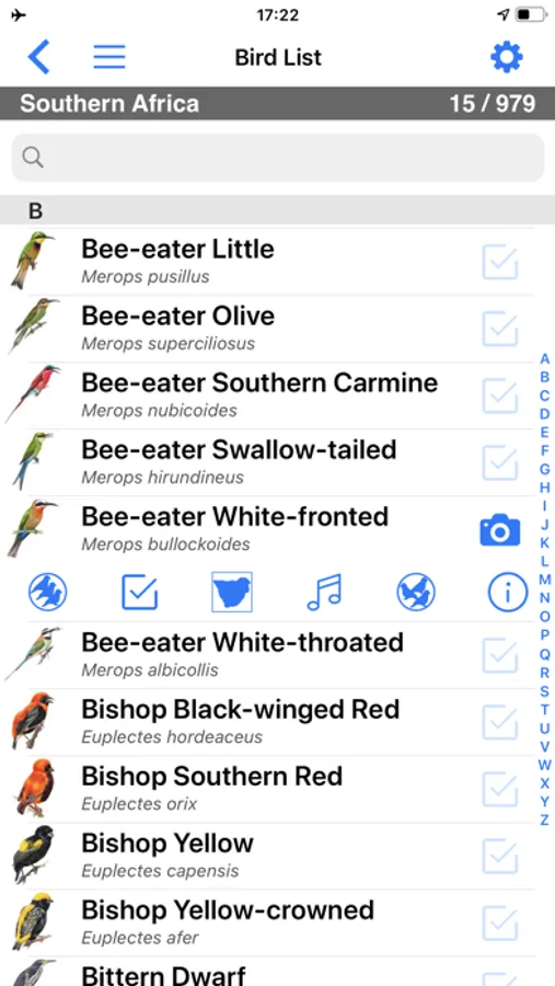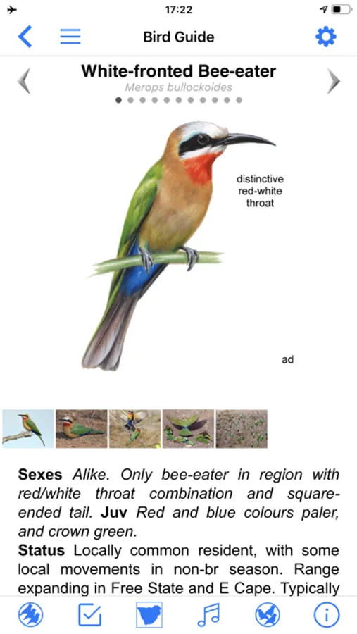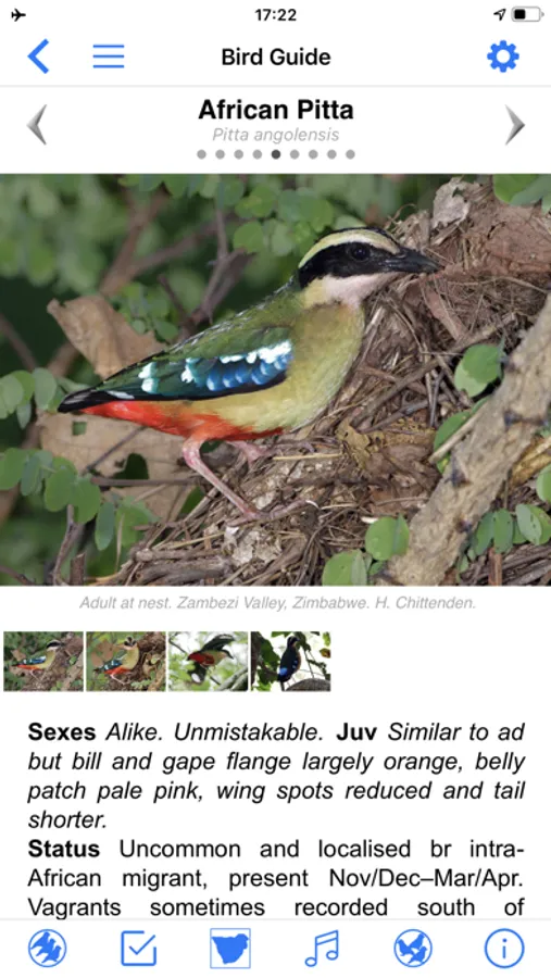 The BIRD GUIDE is a full bird list with direct functions to play the sound, add a sighting, check the distribution, read the text, or open the BIRD PAGE. New features include large thumbs and text, and dual language display of English, Afrikaans, Scientific, Dutch, French, German, Italian, Portuguese, Spanish, Swedish, Chinese and Japanese names;