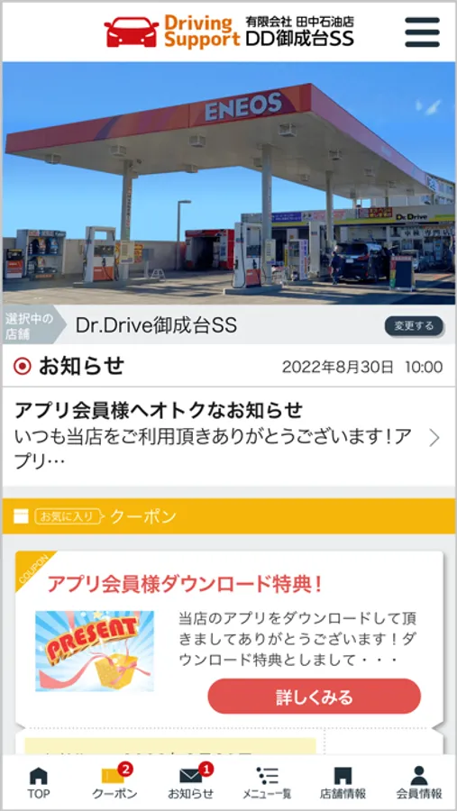 当社の公式アプリ「有限会社田中石油店SSアプリ」はご来店・洗車・カーメンテナンスをするたびにスタンプが貯まり、決められたスタンプ数を貯めるとお得なプレゼントクーポンと引き換えができる、貯めて楽しいもらえて嬉しいお得なアプリです。