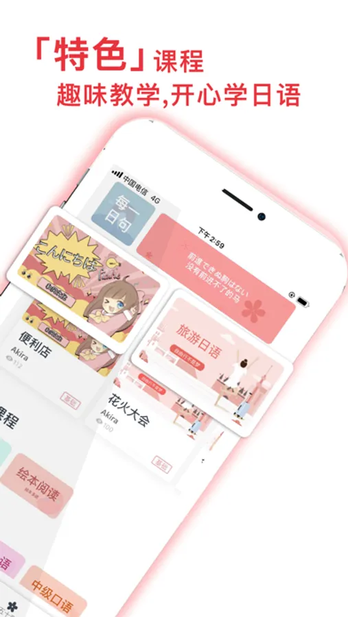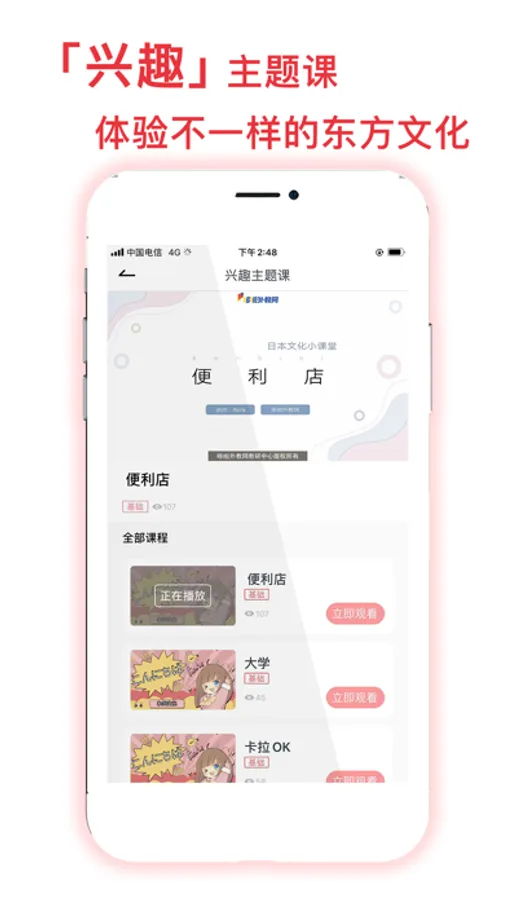 【兴趣主题课】精心录制的兴趣课,包含日语居酒屋、旅游日语、日本文化、唱学日语,让你学语言的同时了解日本文化、日本各类艺术形式。