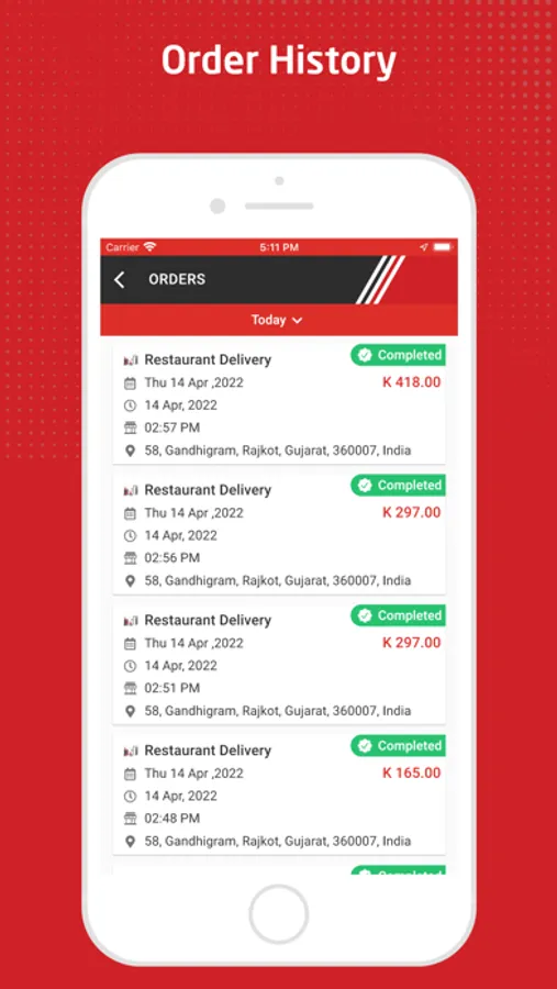 You have an option to see the past and upcoming orders with the details of date & time, address, and order amount.