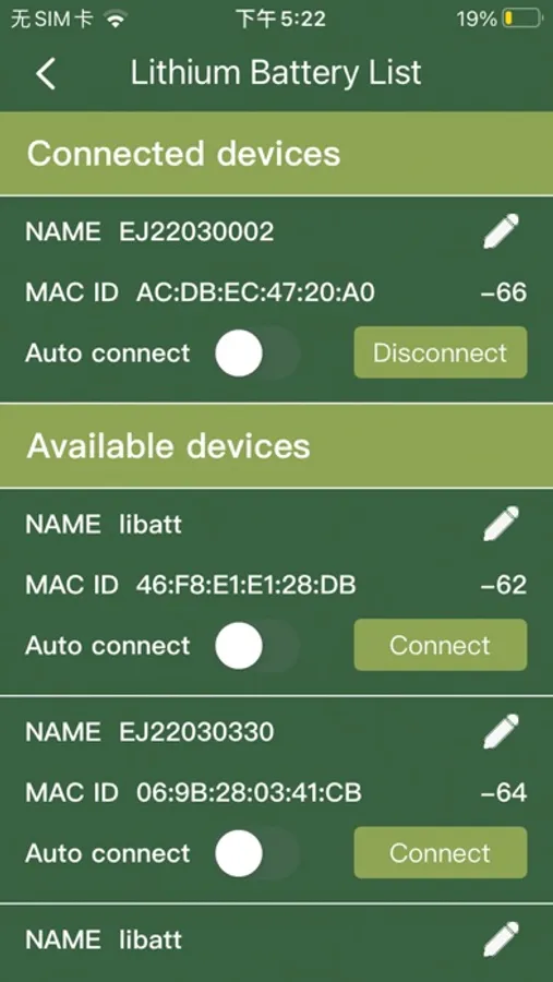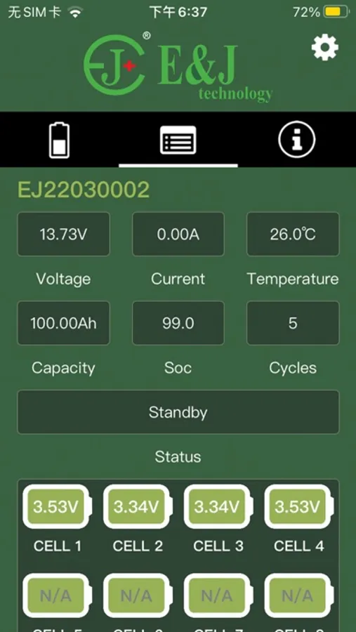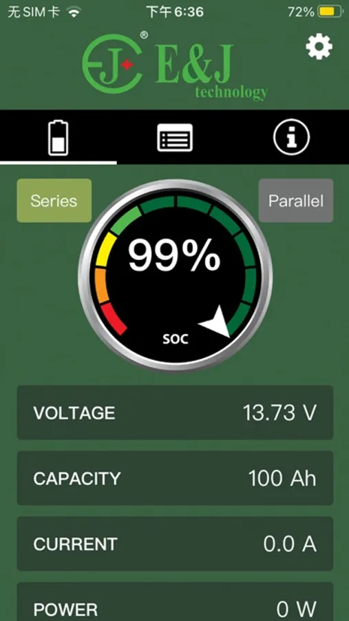 The Apps main feature is to monitor the details of the E&J Lithium batteries. It can monitor multiple batteries at the same time, showing the main data details after series or parallel, showing details of each battery. Re-nameable each battery pack and auto-connect. The Phone via Bluetooth connectivity will monitor the following information from the battery.