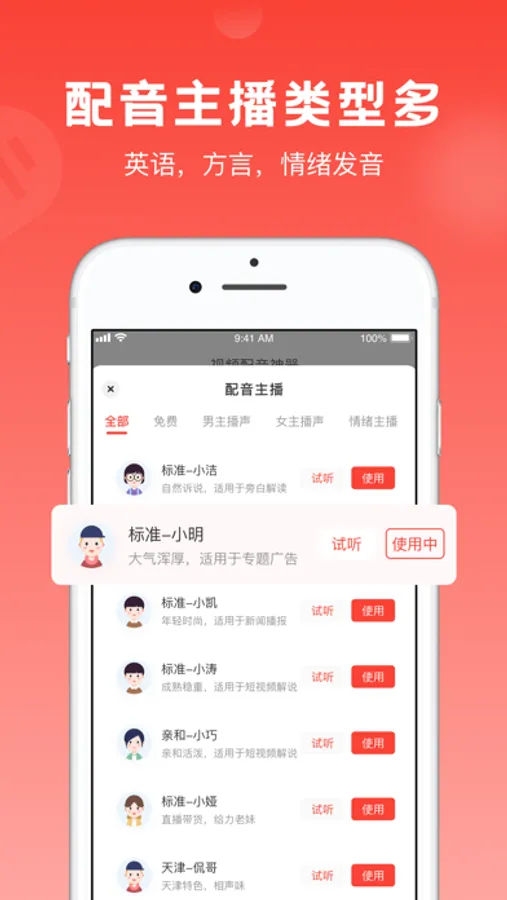 作为一款简单高效的文字转语音配音软件,视频配音神器提供超百种AI主播声音,音色多适合制作配音的场景也多,还提供多种常见的宣传广告等配音模板可供参考使用,让新手上手使用视频配音神器软件更加容易。视频配音神器适用于广告促销配音、自媒体视频配音、各类宣传片配音、教学课件配音等制作。