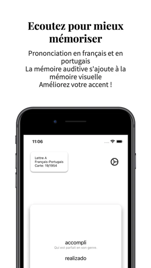 Les mots ainsi que leur traduction sont prononcés (en portugais et en français) afin que vous puissiez bénéficier de la mémoire auditive. Par la même occasion, vous pourrez perfectionner votre accent en portugais.