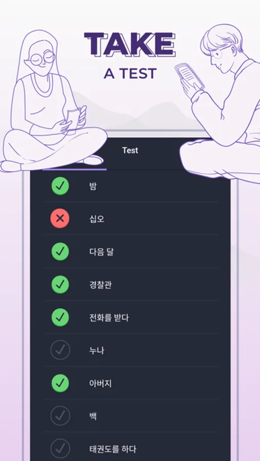 Learn Korean faster with our special repetition system! Immerse yourself in a language adventure, adding new words to your vocabulary every day. Improve your Korean words and pronunciation, and explore interesting topics. There are 20 topics + a test for all levels.