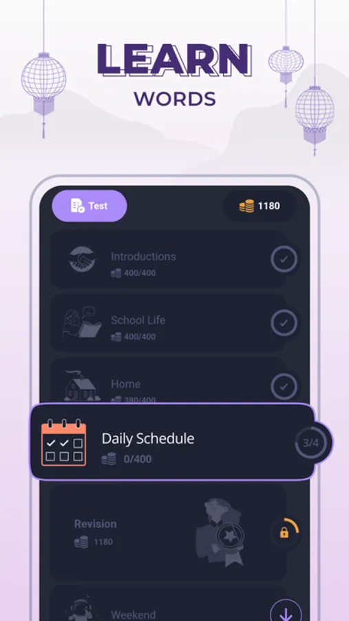 2Shine is like your personal tutor, providing essential vocabulary for each level. Unique illustrations and word games in 2Shine make word retention easier.