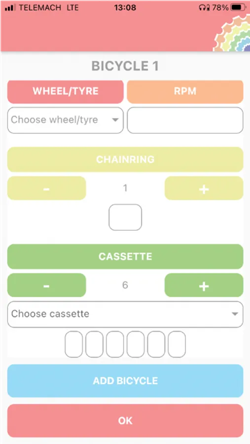 Wheels and tyre size can be chosen out of given list. There is a blank field RPM that you must fill out with revolutions per minute. Next you must choose number of chainrings and fill them out with chainring size. Last you must choose number of cogs in the cassette. You can fill out blank fields manually or can choose one out of given list - you can also customize it.