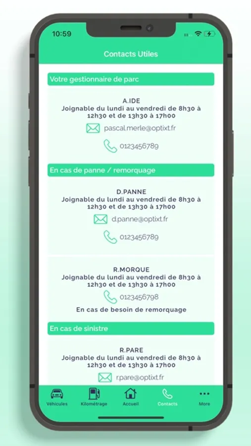 Contacts : Y sont regroupés tous vos contacts utiles en cas de besoin.