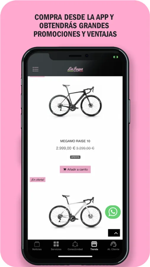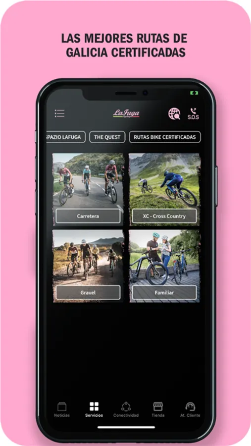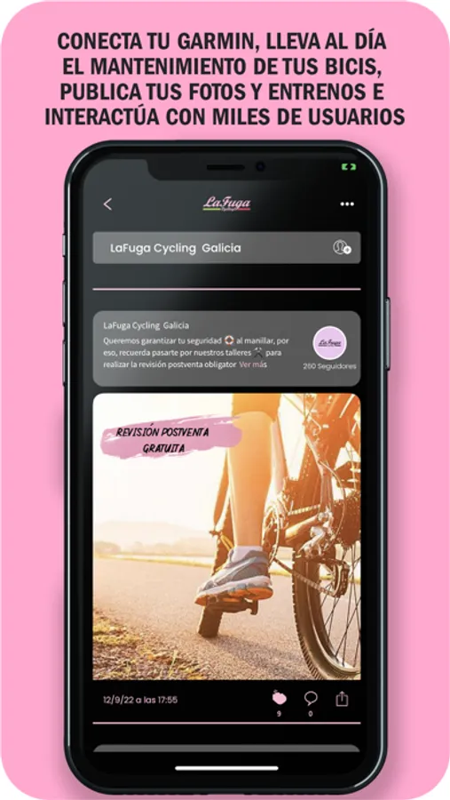 Entra a formar parte de LaFuga Cycling de la mano de nuestra App, repleta de ventajas, experiencias, rutas certificadas y salidas para conocer y disfrutar de toda Galicia. Te beneficiarás de: 1. infórmate de salidas y carreras, 2. llevar un control de tus bicis con avisos de mantenimiento para taller 2. Recibir promociones y ofertas personalizadas si te das de alta en nuestro programa de fidelización #Fugados. 4. acceder y comprar a nuestra tienda online, alquilar bicis,….5. crear tu propia comunidad ciclista a través de su plataforma social ¡Y muchas más sorpresas!