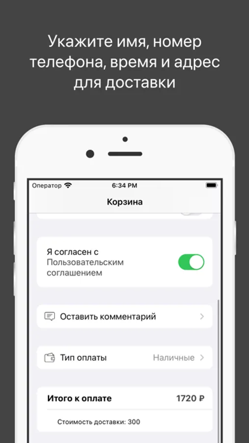 На экране заказа добавьте свою контактную информацию для первого заказа: Имя, Номер телефона и адрес электронной почты, чтобы получать уведомления об оплате.