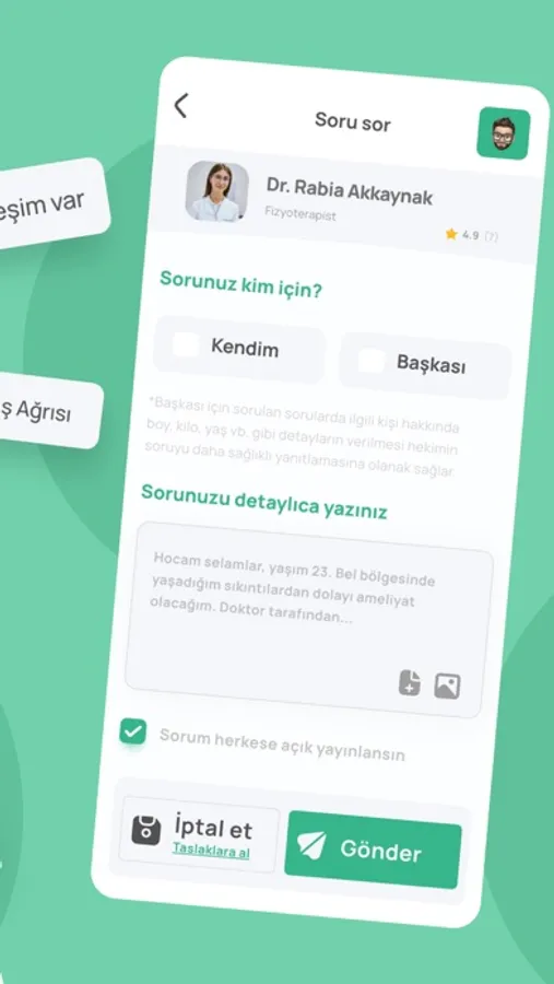 Kullanıcı dostu arayüz tasarımı ile birçok branşta arama yapabilir, istediğin hekime danışabilirsin. Unutma, hekimlerin profil kartlarında bulunan puanlar danışanların memnuniyetini yansıtır.