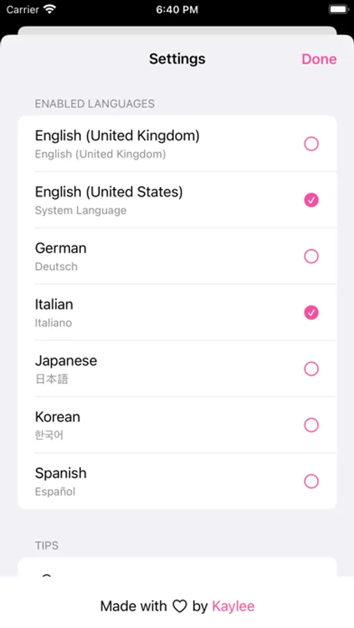 Polyglots can easily enable multiple languages and quickly switch between them. English (UK and US), German, Italian, Japanese, Korean, and Spanish are supported. If your language isn’t supported, please email feedback@kaylees.site and let me know.