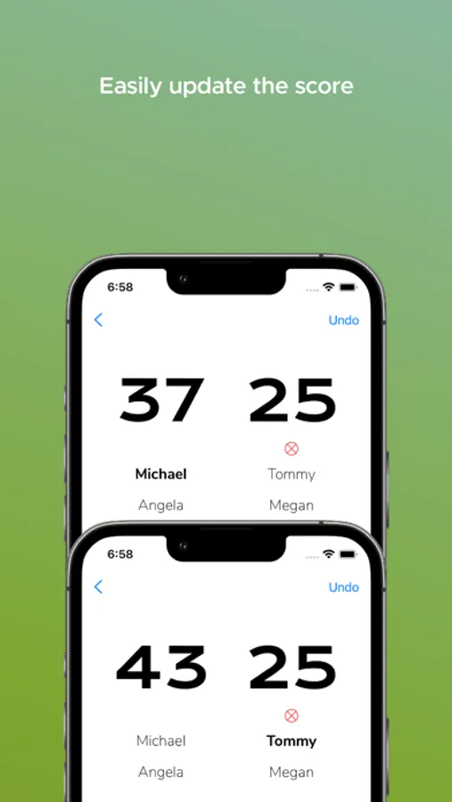 Just place your team or players' names and input their points as you go, the score of the game will update automatically so you can focus on playing and not on mental math.