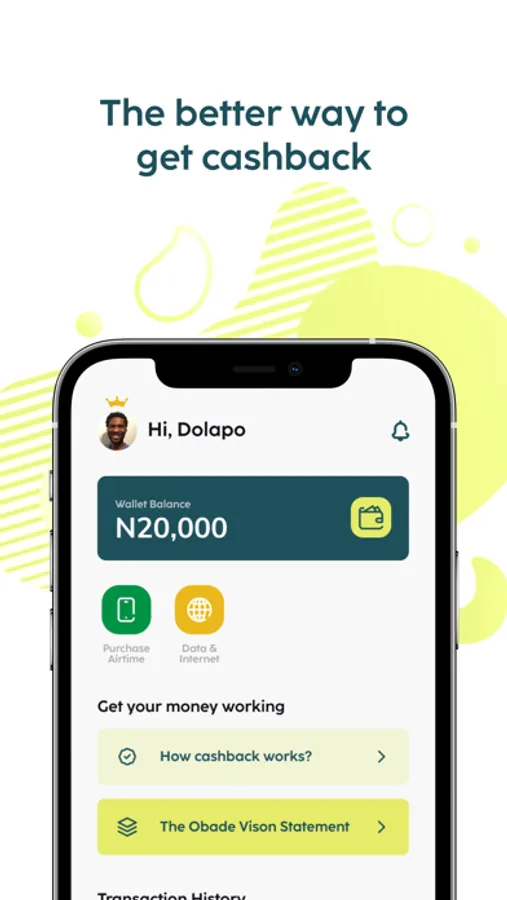 Earn rewards and make savings everyday. Get instant cashback every time you purchase your airtime and data through the Obade app. (MTN, Glo Airtel, 9Mobile).