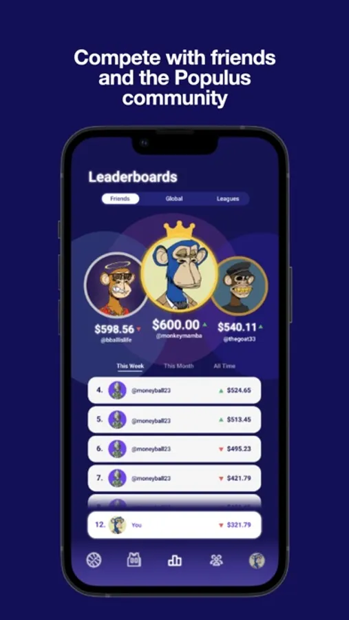 Challenge your friends in Leagues or compete 1v1 to climb the Leaderboard rankings. With no real money involved, Populus offers a fun and risk-free way to test your sports trading skills.