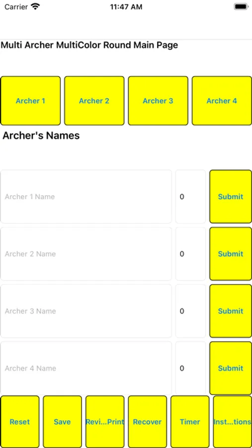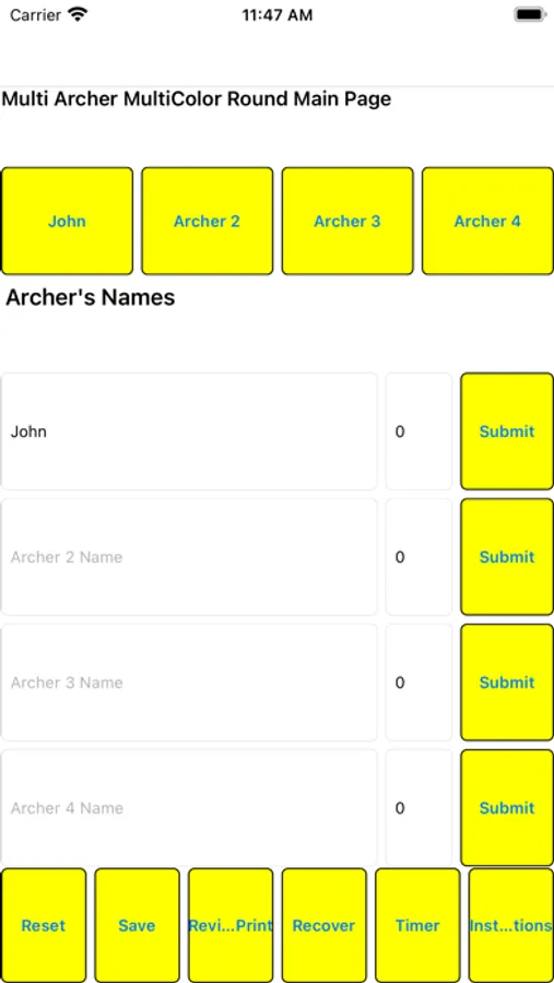 The Multi Color round (also known as the Vegas round) is shot with either a 40 centimeter or 3 spot multi color target. It consists of 3 arrows in each of 10 ends, for a total of 30 arrows. Each end has a 2 minute time limit. The maximum possible score is 300 points. X’s are also counted as they act as a tie breaker. This application provides the user with the capability to track the scores of up to 4 archers. It has the ability to save rounds and recover them for review. Also included are a Printing function (using a PDF format) and a built in 2 minute timer.