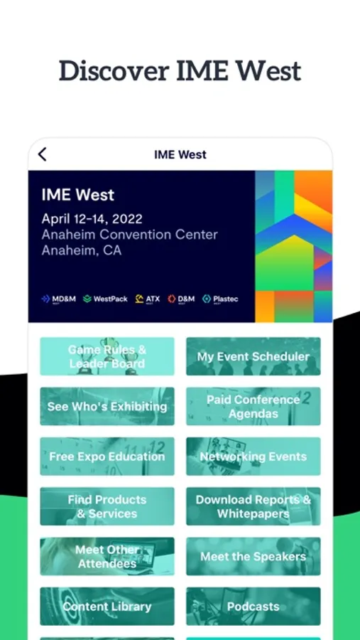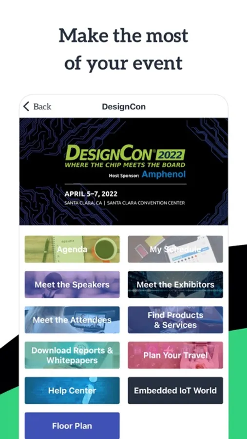 Use the app to build your personalized agenda, interact with floorplans, check out other attendees, get notifications about upcoming sessions, exclusive offers, and more.