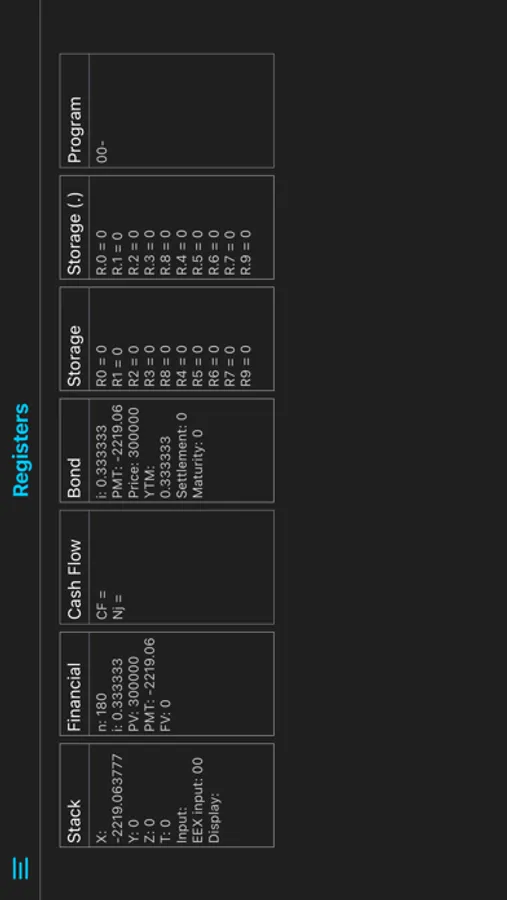 The register views, accessible in the main screen, provides visibility into various register groups. You can switch between different groups of registers (such as Financial, Cash Flow, Bond, etc.), and inspect stored values.