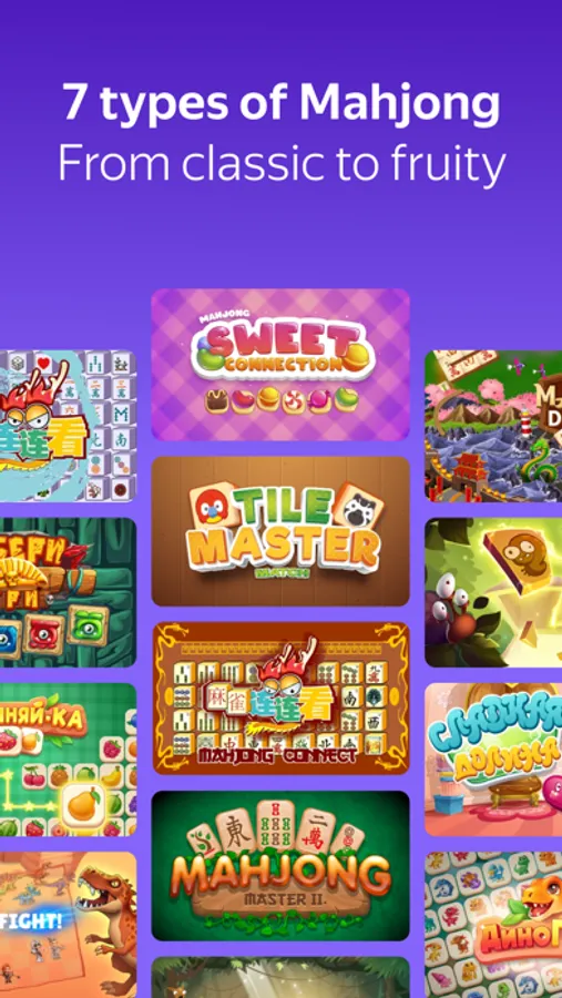 A selection of mahjong games for every taste in the Mahjong for everyday! From classic to fruity, from marmalade to narrative. Match identical tiles on the board and train your attentiveness with the Collection of mahjong!