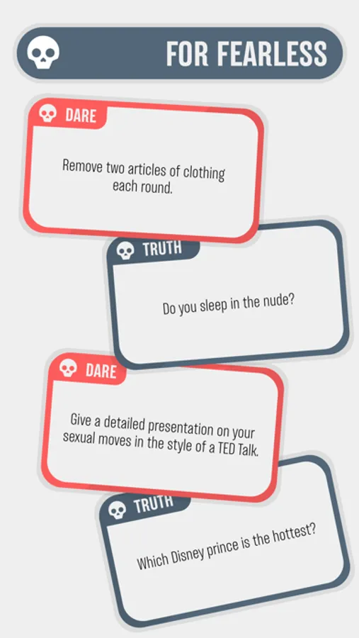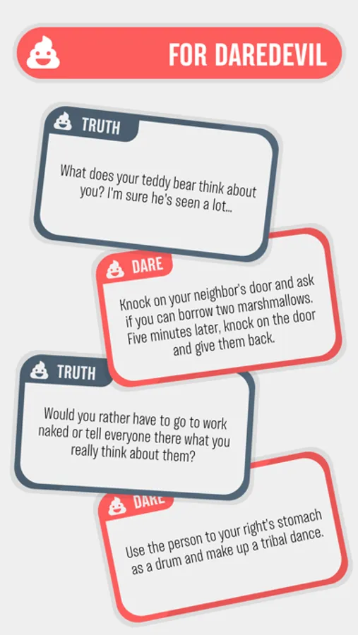 Pass the phone around in a circle and choose between answering tricky questions or completing tasks - fun, spicy, and absolutely unlimited! Leaving the game is not allowed, avoiding answering the question is not allowed, refusing to perform an action is not allowed! This is an exciting game that is perfect for meeting new people, meeting friends, parties, and romantic evenings!