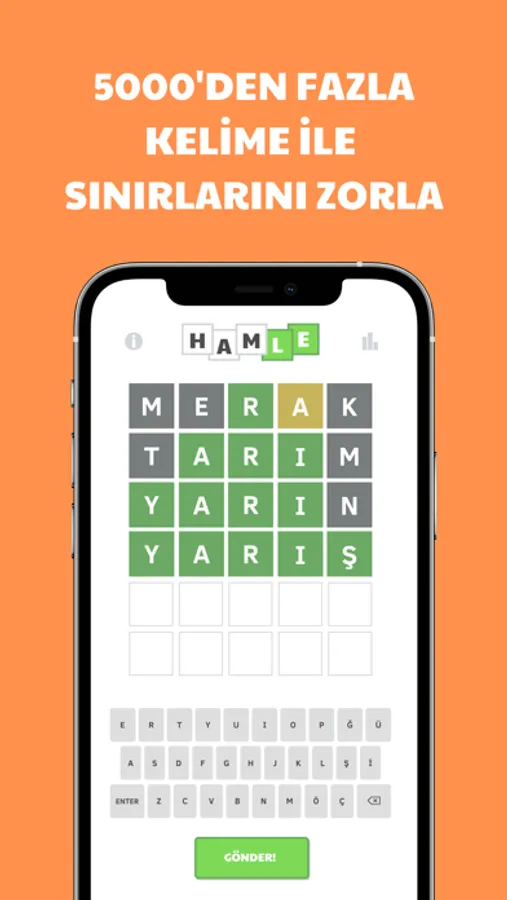 - Tahmin ettiğin kelimeyi yaz ve ‘GÖNDER’ butonuna bas - Her hamleden sonra kutucukların renkleri tahmininizin yakınlığına göre değişecektir.