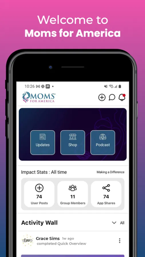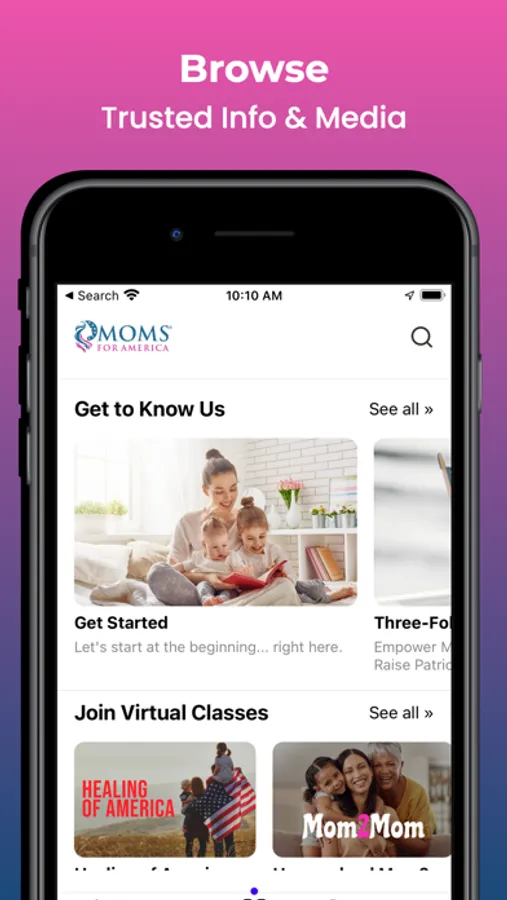 The Moms for America app provides moms with resources and support in their journey, allowing them the confidence to raise strong patriots, and make a change in their communities. Programs like MomVote, MomForce and Family Lobby are available to the MomLinks community, as well as gamification to encourage connection and involvement.