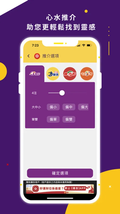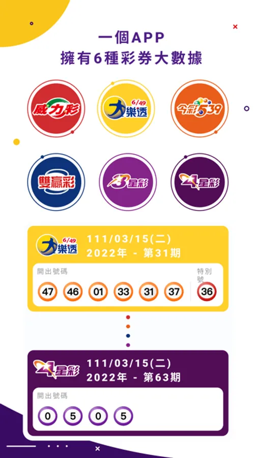 The APP supports 6 types of lottery tickets in Taiwan (Power Lottery, Big Lotto, Jincai 539, 3 Star Lottery, 4 Star Lottery, Win-Win Lottery)
