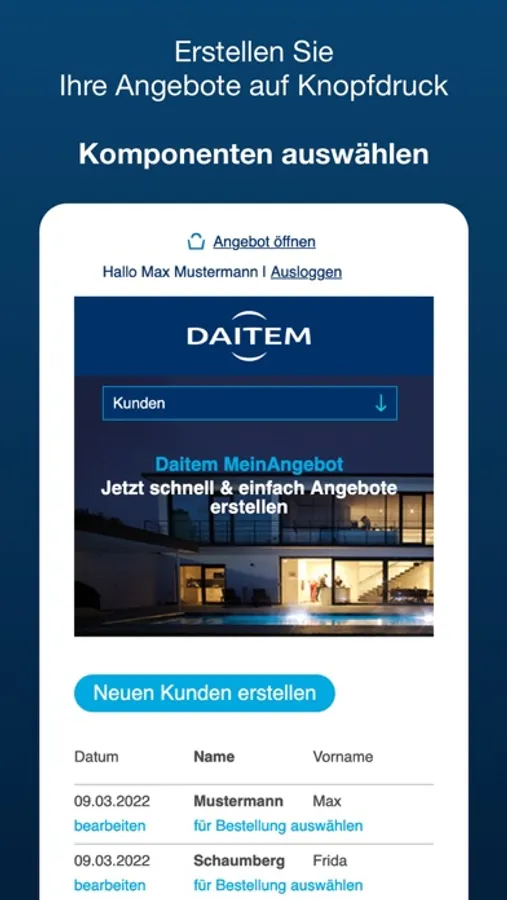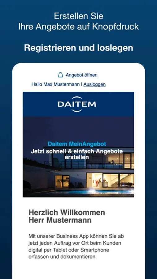Mit Daitem MeinAngebot haben Sie immer und überall Ihre Angebote für Ihre Kunden im Blick. Bei Fragen wenden Sie sich einfach an marketing@daitem.de.