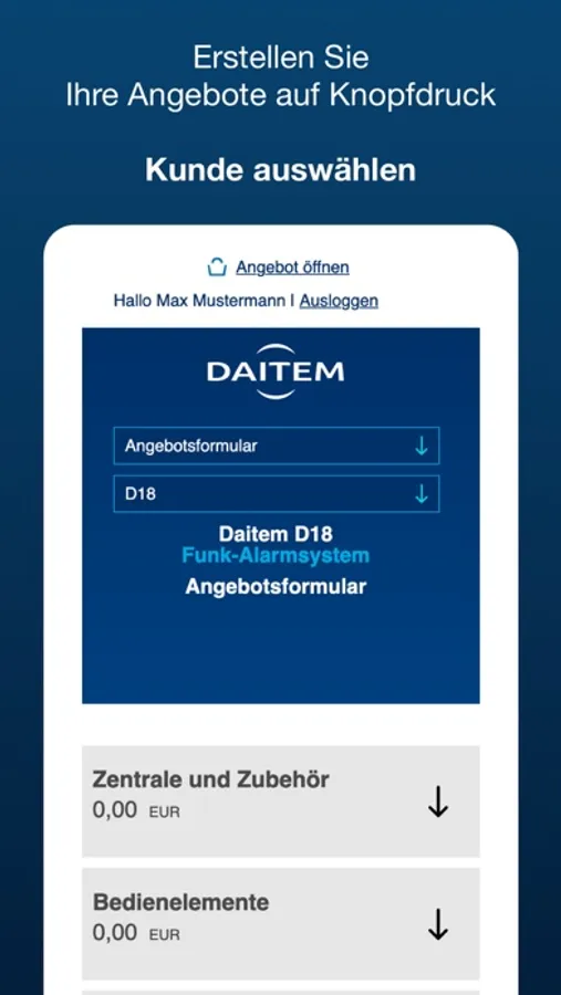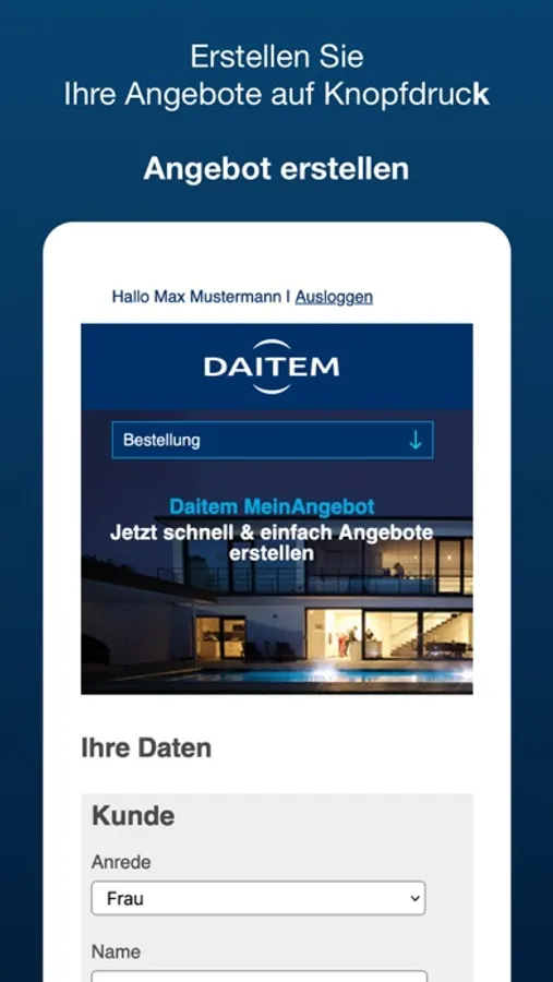 Noch nie war eine Angebotserstellung so einfach! Mit Daitem MeinAngebot können Sie schnell, effizient und flexibel ein Angebot für Ihren Kunden anfertigen.