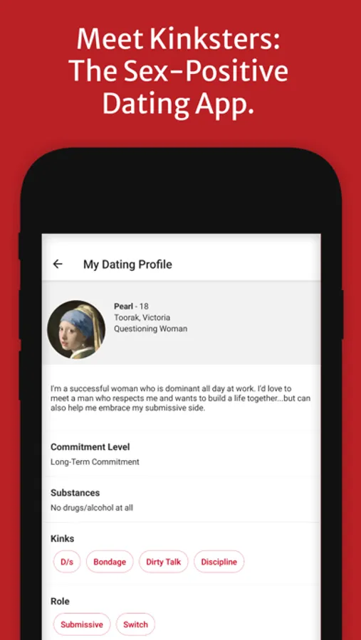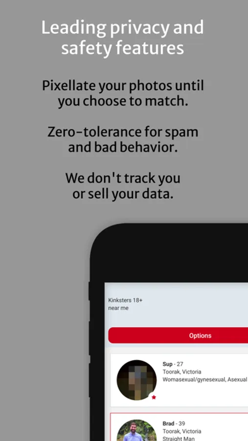 Chat with your matches safely in our app before deciding to meet in public and determine if there’s a connection. We proactively monitor profiles and photos to ensure compliance with our strict community guidelines. Meet Kinksters is committed to a safe online dating experience, particularly for women and femme/femme-presenting people.