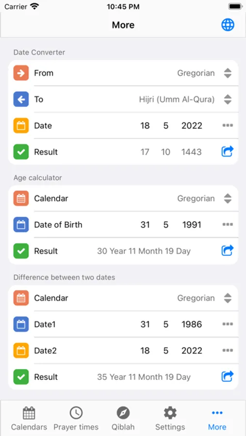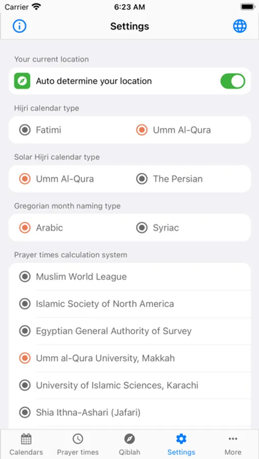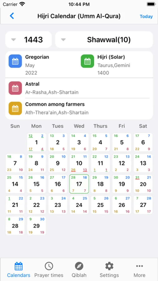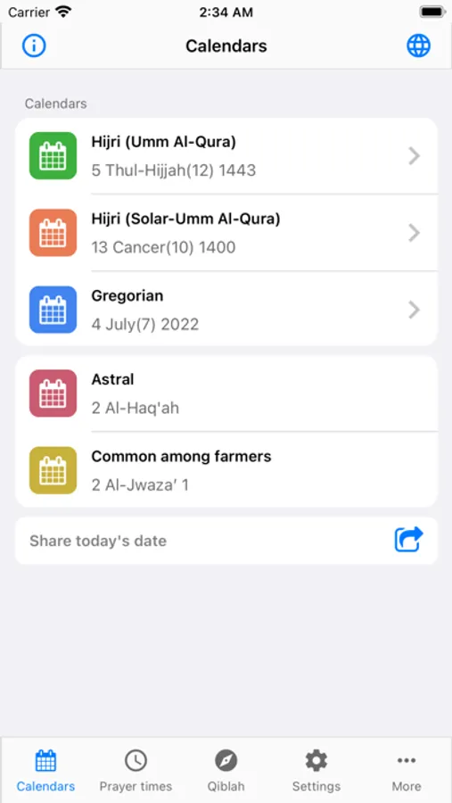 - A comprehensive application for each of the calendars (Gregorian - Hijri (Fatimi) - Hijri (Umm al-Qura) - Solar Hijri (Umm al-Qura - Persian) - Astral - Common among farmers).