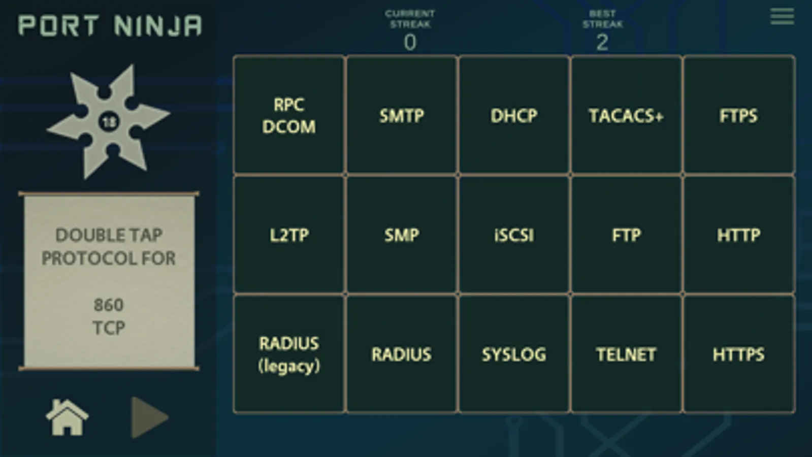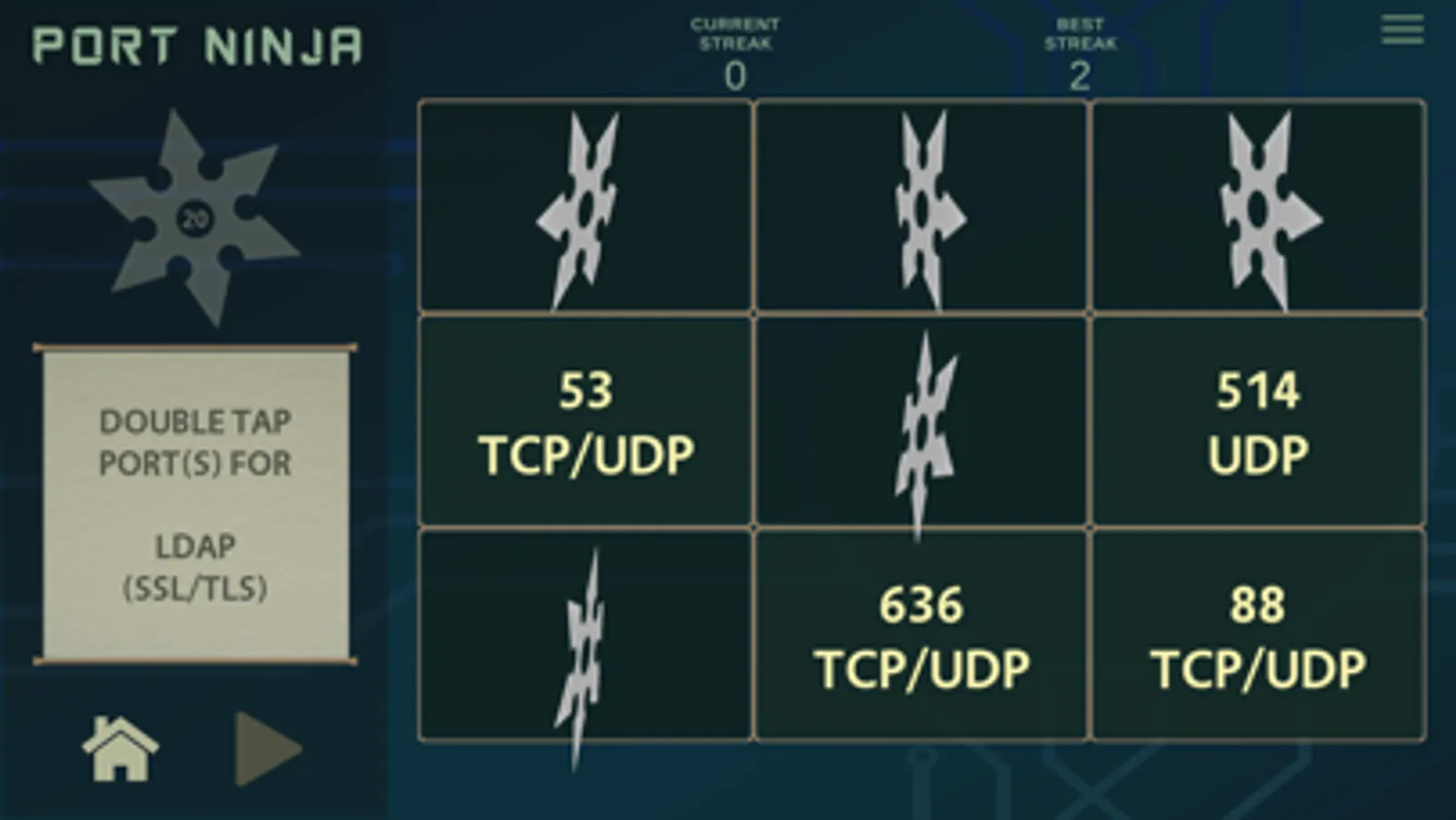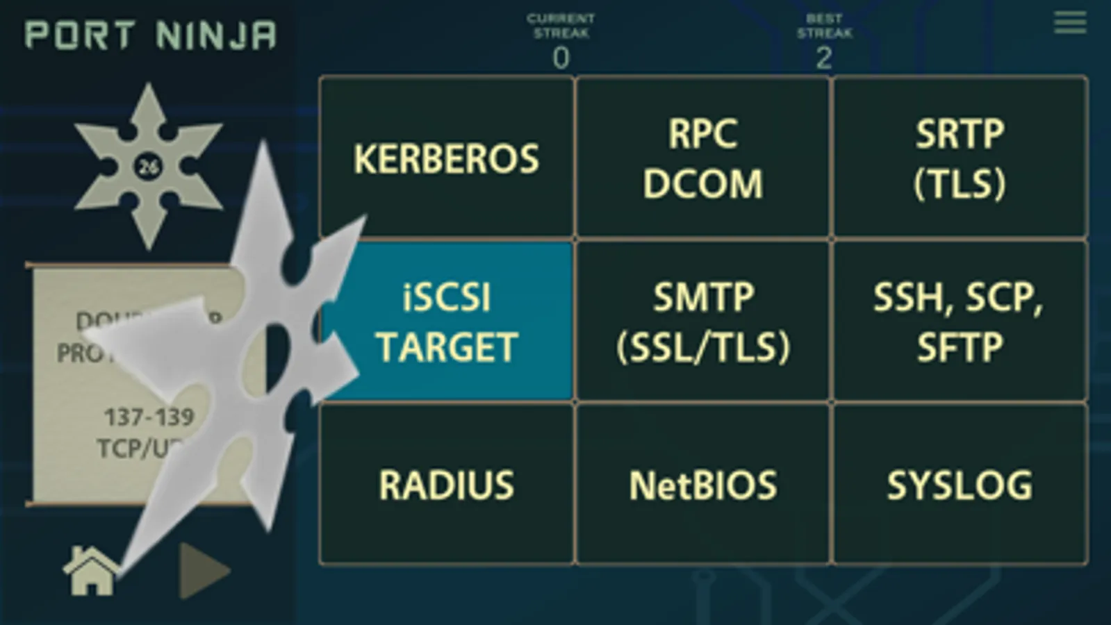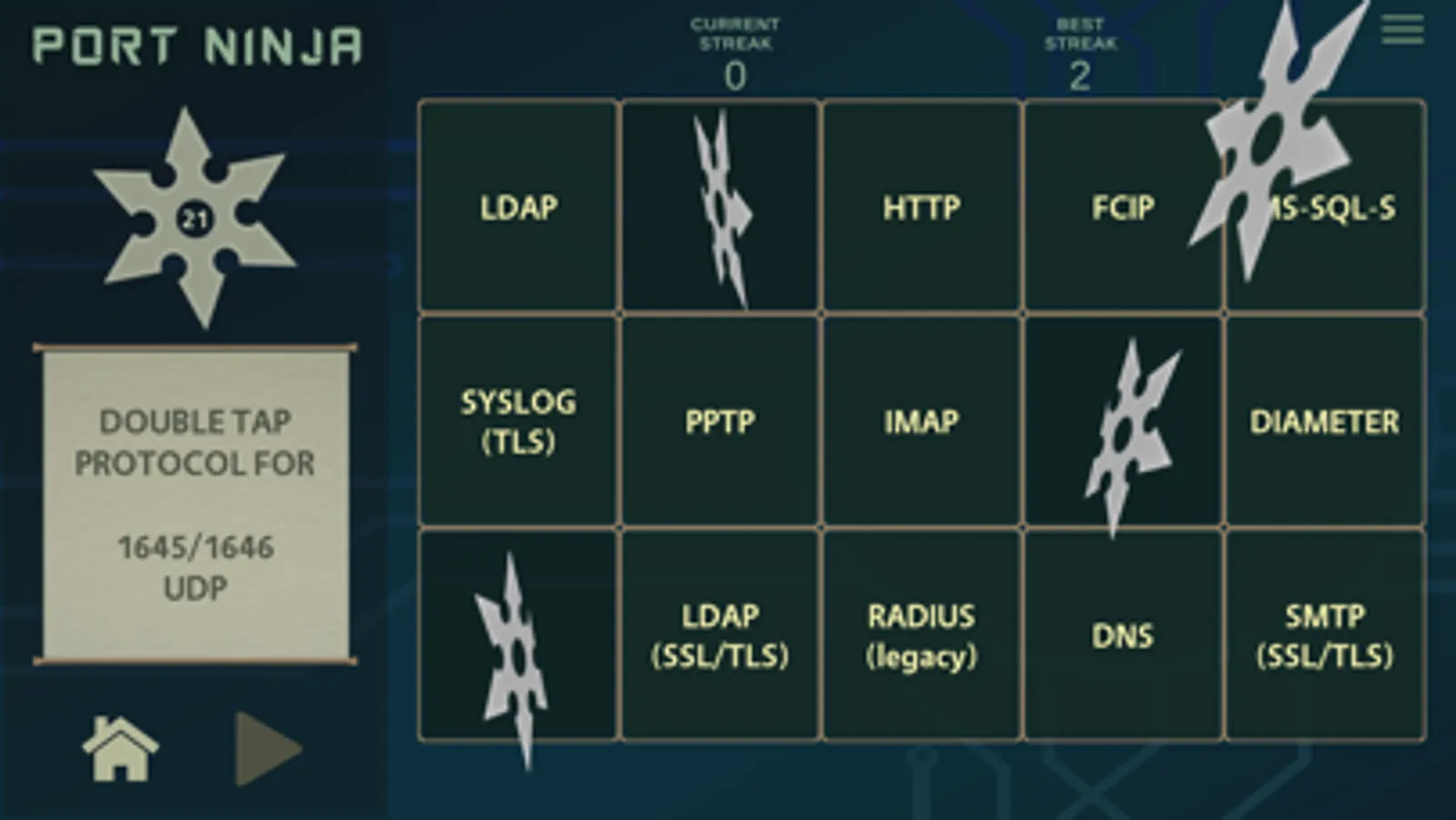 Sharpen your shuriken and use them to match network protocols with their traditional default port values. This app presents a fun way for anyone wanting to learn common network ports and their protocols. Hone your inner ninja skills now and become a true Port Ninja!