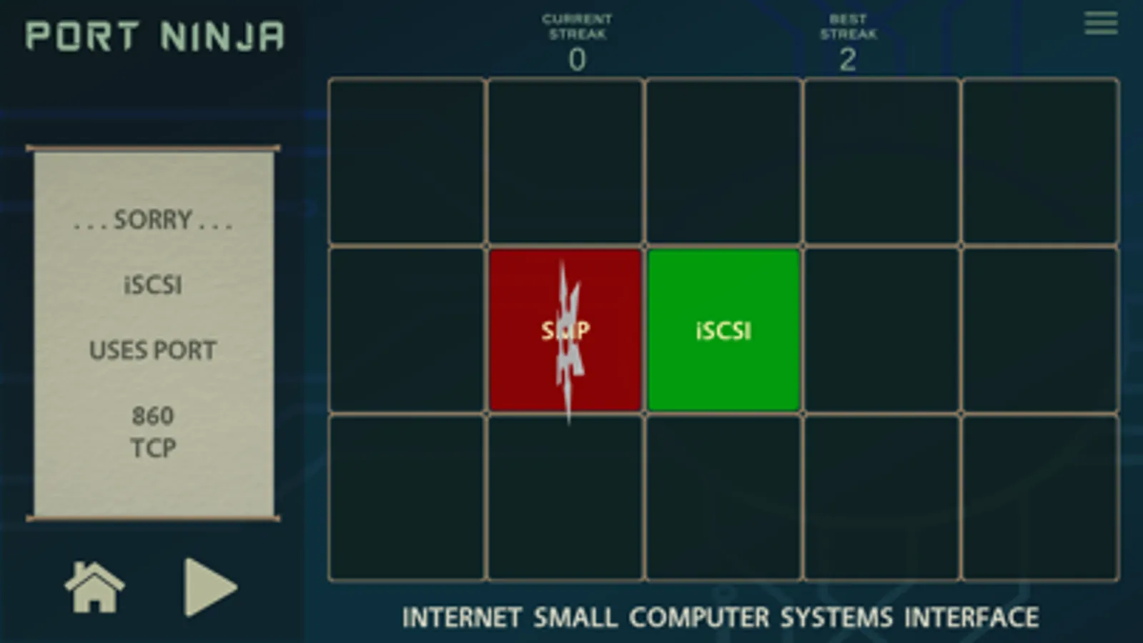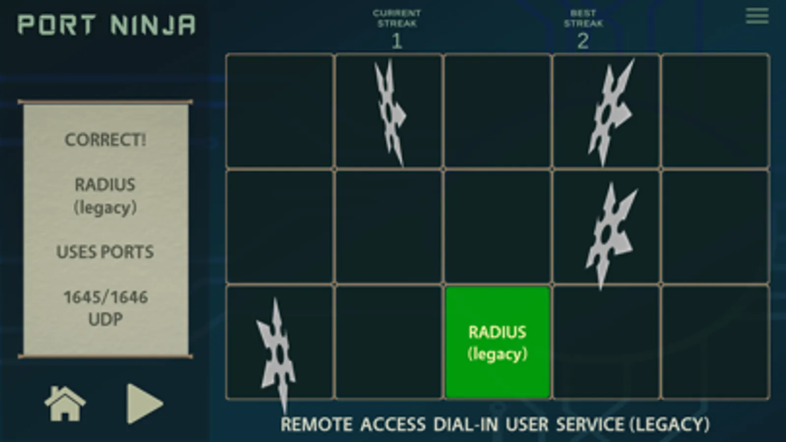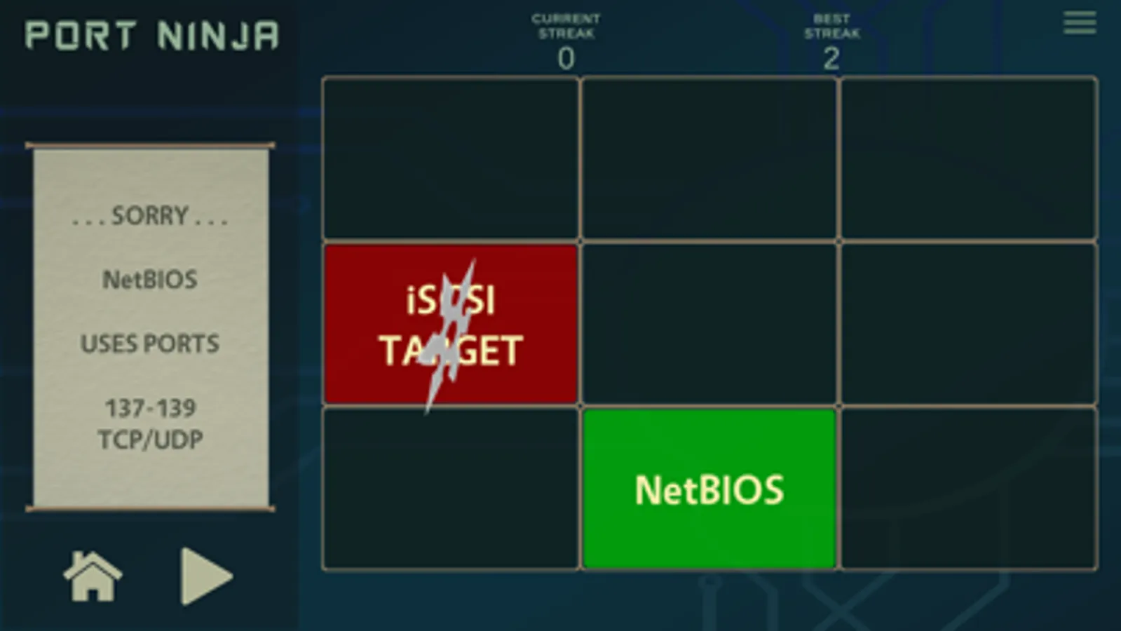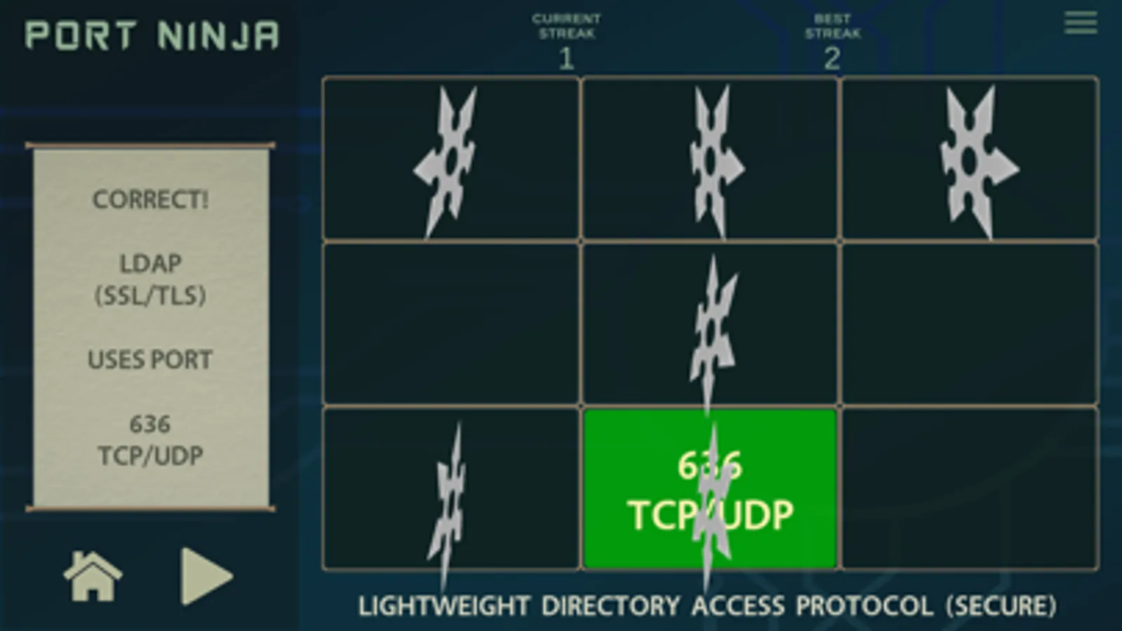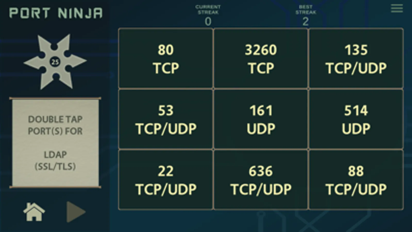 Sharpen your shuriken and use them to match network protocols with their traditional default port values. This app presents a fun way for anyone wanting to learn common network ports and their protocols. Hone your inner ninja skills now and become a true Port Ninja!