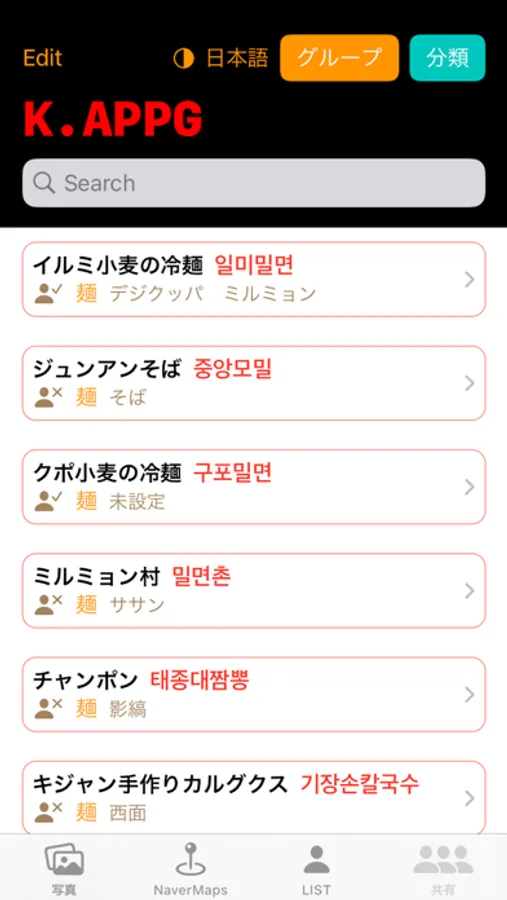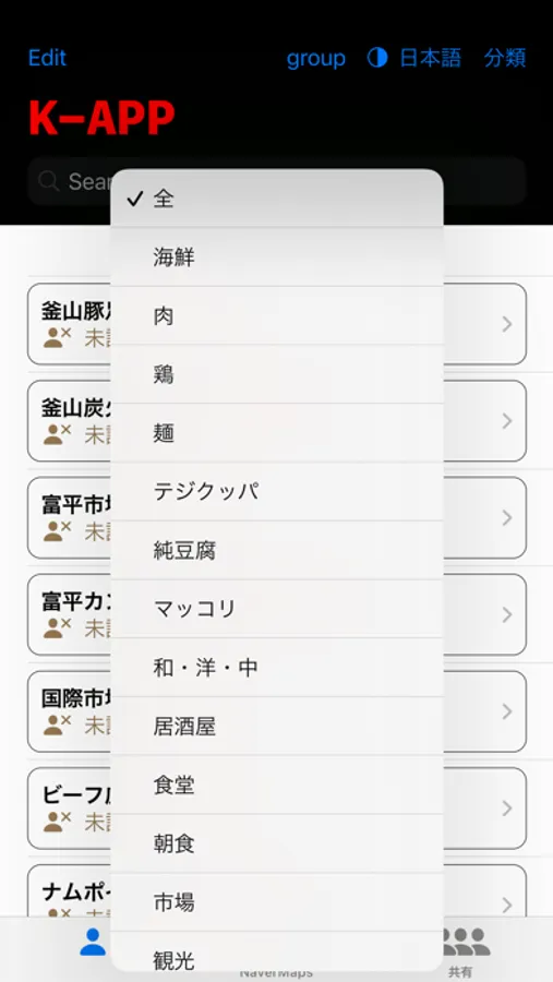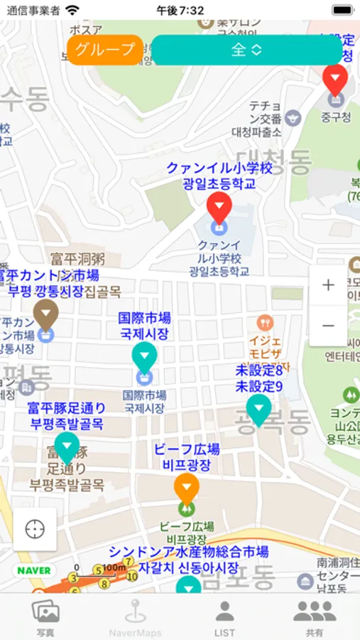 韓国旅行地図アプリ。NAVER地図上をタップし地点登録。地図(マーカー)・リスト(表)・検索機能・現在位置表示等により情報を管理。共有機能を使えば、他のユーザとも情報共有が可能。