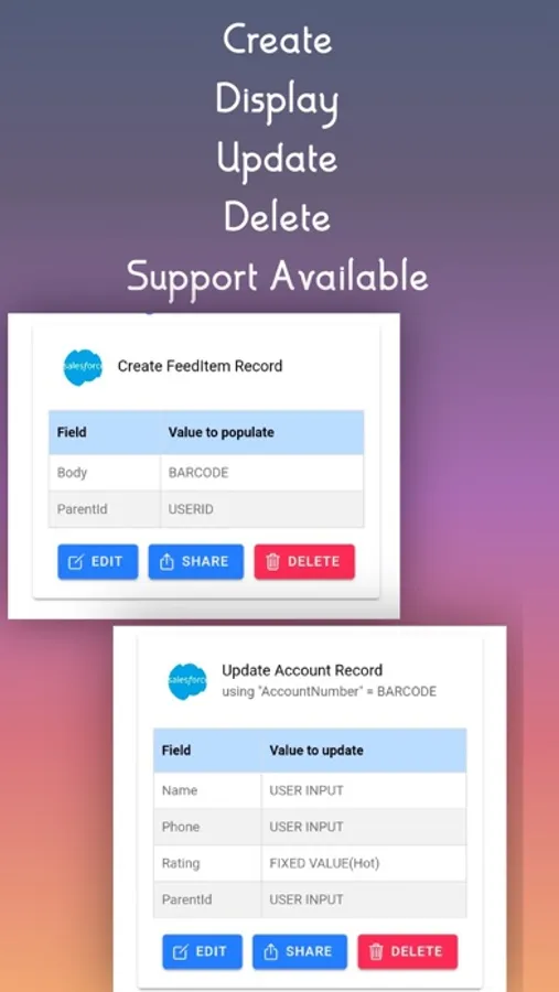 Allows you to scan different barcode formats and send data to Salesforce. You can configure the app to do any of the below activities in Salesforce when a barcode is scanned,