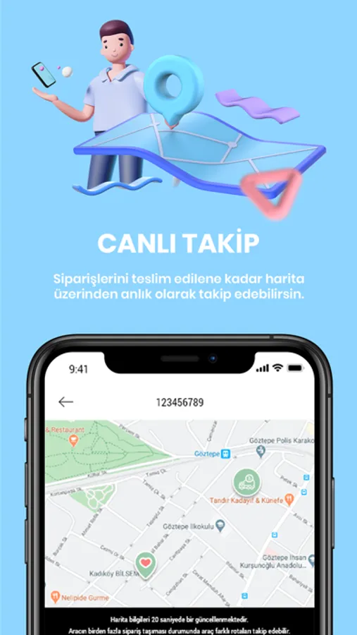 Oluşturduğunuz siparişleri takip etmek yeni mobil uygulamamızla çok kolay. Sipariş takiplerinizi canlı harita özelliği ile an ve an takip edebilir, siparişinizin şu an nerede olduğunu anında görebilirsiniz.